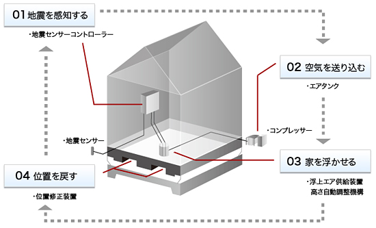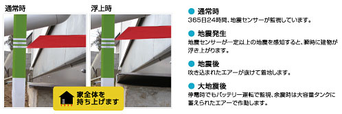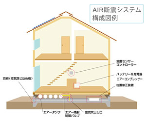 | エアー断震システムは簡単にいうと、空気の力で家を空中に浮かせて地震の揺れから避難するための、最新の地震対策装置です。 地震が発生した時、地面は揺れますが、まったく地面と接していない浮いた家なら揺れません。その理屈を具現化したのがエアー断震装置。 揺れが少なく、家の倒壊はもちろん、家具の横倒しなどによる被害も、未然に防ぎ自分の身や最愛の家族を守ることができます。