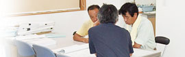 息子さんといっしょに大工仕事を取り仕切ります。細かいところまで丁寧な仕事をするだけでなく、家を建てるお客様のためにならないようなことは、どんどん改める頼もしい棟梁です。 |